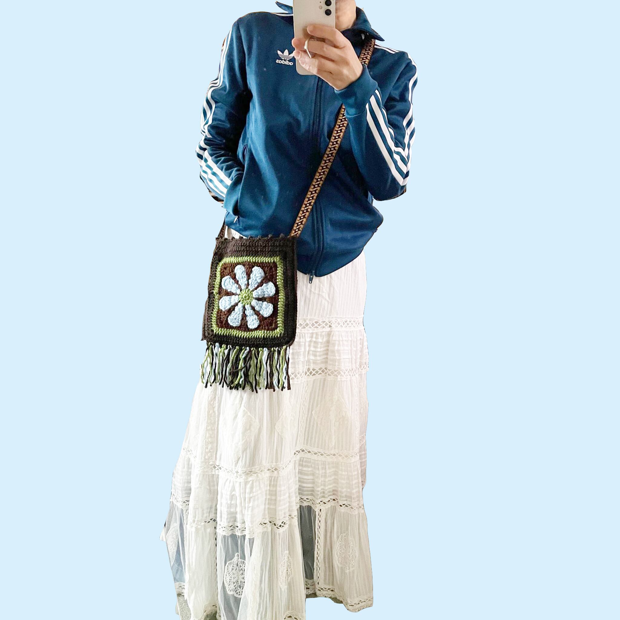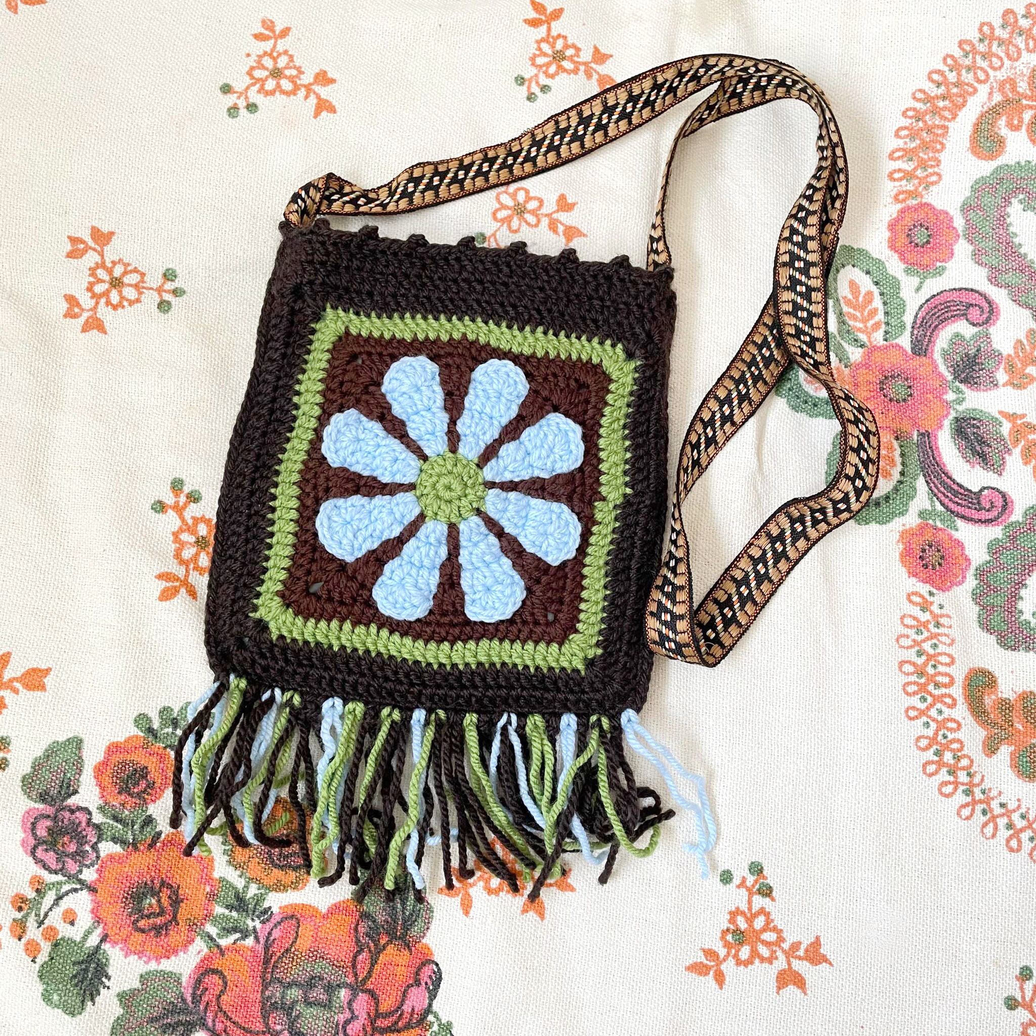 アクリル毛糸で編んだレトロデイジーモチーフのポシェット。肩紐はチロリアンテープ(調節不可)。